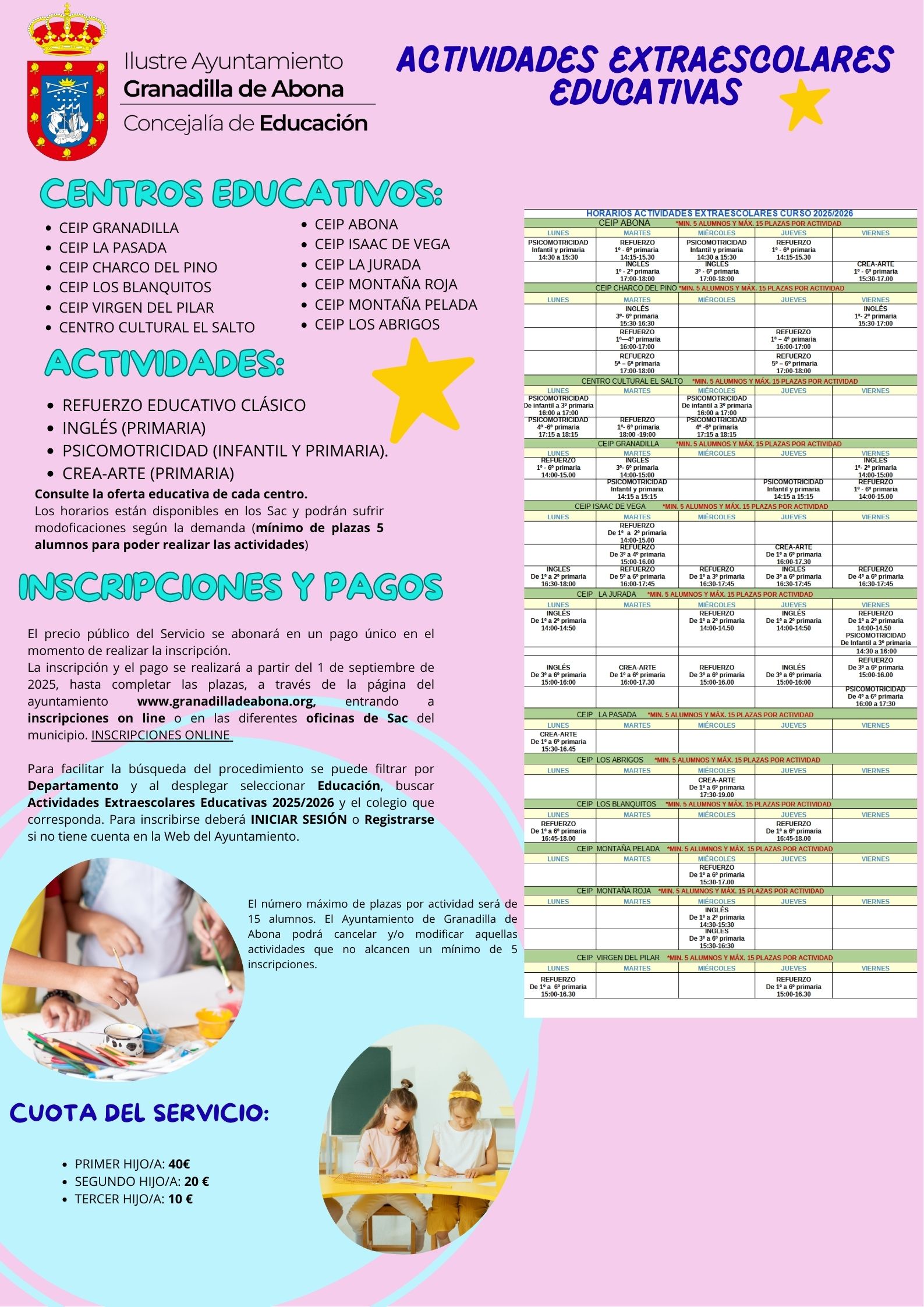 El Ayuntamiento de Granadilla de Abona, a través de la concejalía de Educación que dirige Raquel Morales Izquierdo, informa de que el lunes 1 de septiembre comienza el plazo para la inscripción a las Actividades Extraescolares Educativas 2025-2026, y que estará abierto hasta completar las plazas disponibles.