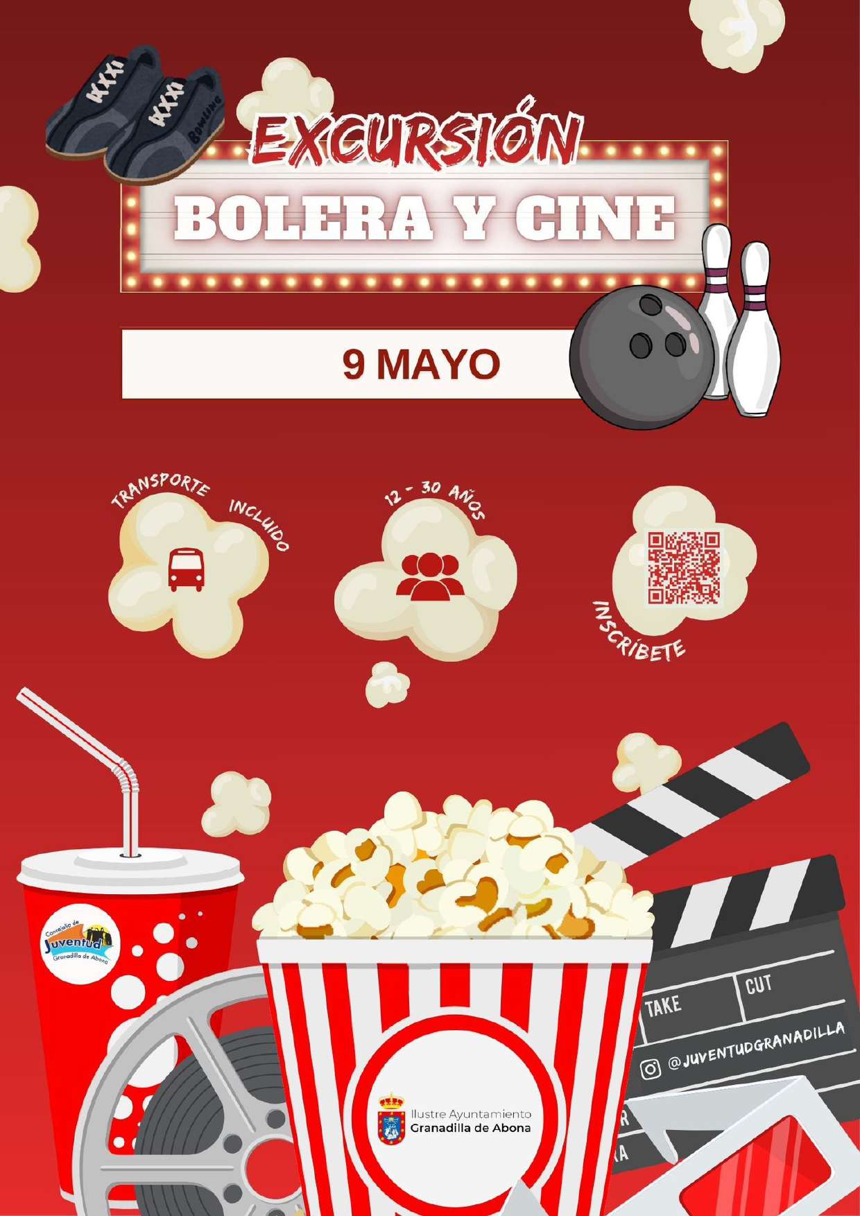 El Ayuntamiento de Granadilla de Abona, a través de la Concejalía de Juventud, que dirige Raquel Morales Izquierdo, te invita a participar en la actividad CINE – BOLERA MAYO 2026, que tendrá lugar el sábado 9 de MAYO de 2026, con salida desde las 14:30 horas con regreso estimado sobre las 20:30 horas La actividad CINE – BOLERA MAYO es gratuita, consiste en 2 actividades que incluyen partida de bolos en grupo y entrada al cine x-sur.