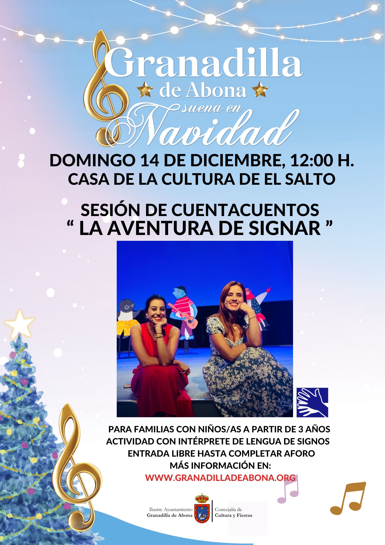 El Ilustre Ayuntamiento de Granadilla de Abona, a través de la Concejalía de Cultura y Fiestas, cuyo responsable es Carlos Abismael Díaz Barreto, les invitan a participar en la sesión de cuentacuentos » La Aventura de signar «, el domingo 14 de diciembre a las 12:00 horas en la Casa de la Cultura de El Salto.