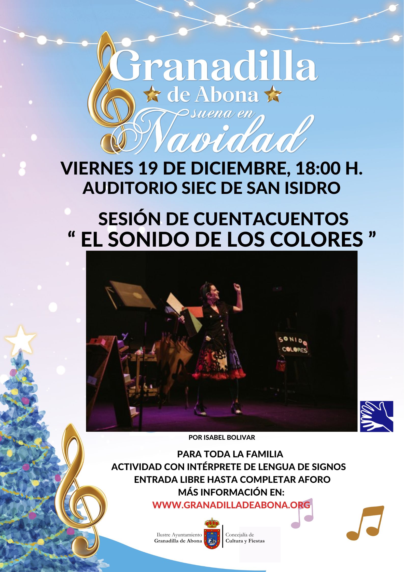 El Ilustre Ayuntamiento de Granadilla de Abona, a través de la Concejalía de Cultura y Fiestas, cuyo responsable es Carlos Abismael Díaz Barreto, les invitan a participar en la sesión de cuentacuentos » El sonido de los colores «, realizada por Isabel Bolívar, el viernes 19 de diciembre a las 18:00 horas en el Auditorio del SIEC de San Isidro.