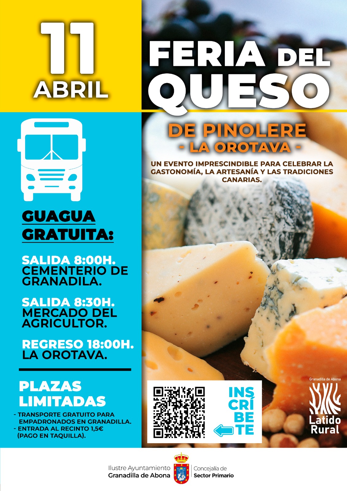 Desde la Concejalía de Sector Primario del Iltre. Ayuntamiento de Granadilla de Abona, que dirige D. José Sanabria González, le invitamos a disfrutar de la Feria del Queso de Canarias en Pinolere, La Orotava, que tendrá lugar el sábado 11 de abril próximo.