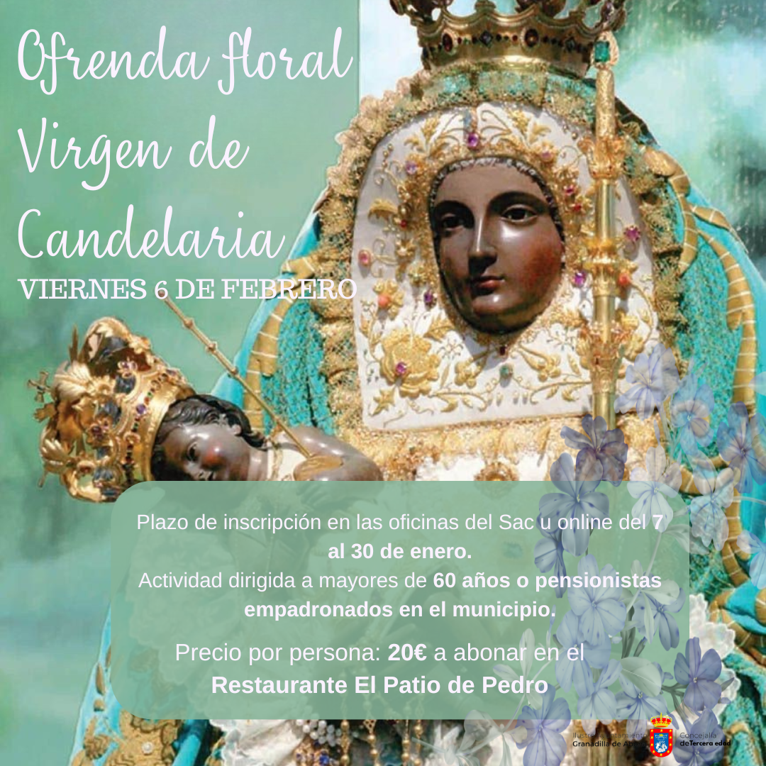 La concejalía de tercera Edad del Ayuntamiento de Granadilla de Abona, cuya responsable es Eudita Mendoza Navarro, les invita a participar en la «Ofrenda a la Virgen de Candelaria 2026«,que se realizará el viernes, 06 de febrero.