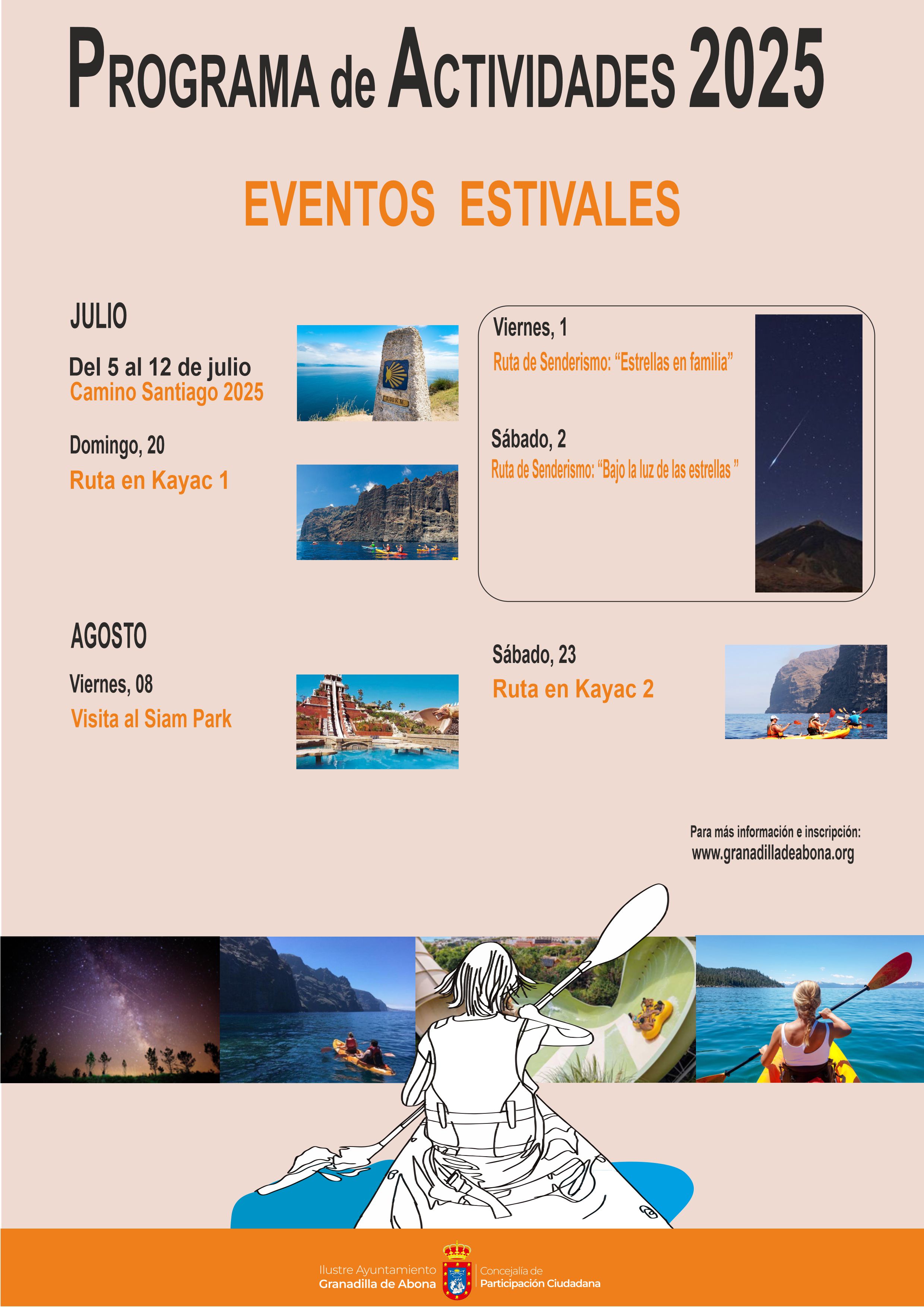 Las actividades están agrupadas en: Rutas de Senderismo, acercando a la población granadillera a los espacios naturales más emblemáticos de la isla de Tenerife, como Teno, Anaga o el Parque Nacional del Teide; Rutas Culturales, Temáticas y Rutas Teatralizadas, con el objetivo de conocer mejor otros municipios, como Candelaria, La Laguna, Fasnia – Arico, Los Silos, Granadilla Casco, La Orotava, Tegueste o Santa Cruz y, por último, actividades para toda la familia, donde se combina, en la época veraniega, la asistencia a museos y espacios culturales con piscinas como el Parque Marítimo de Santa Cruz de Tenerife y el Lago Martiánez del Puerto de la Cruz, entre otros.