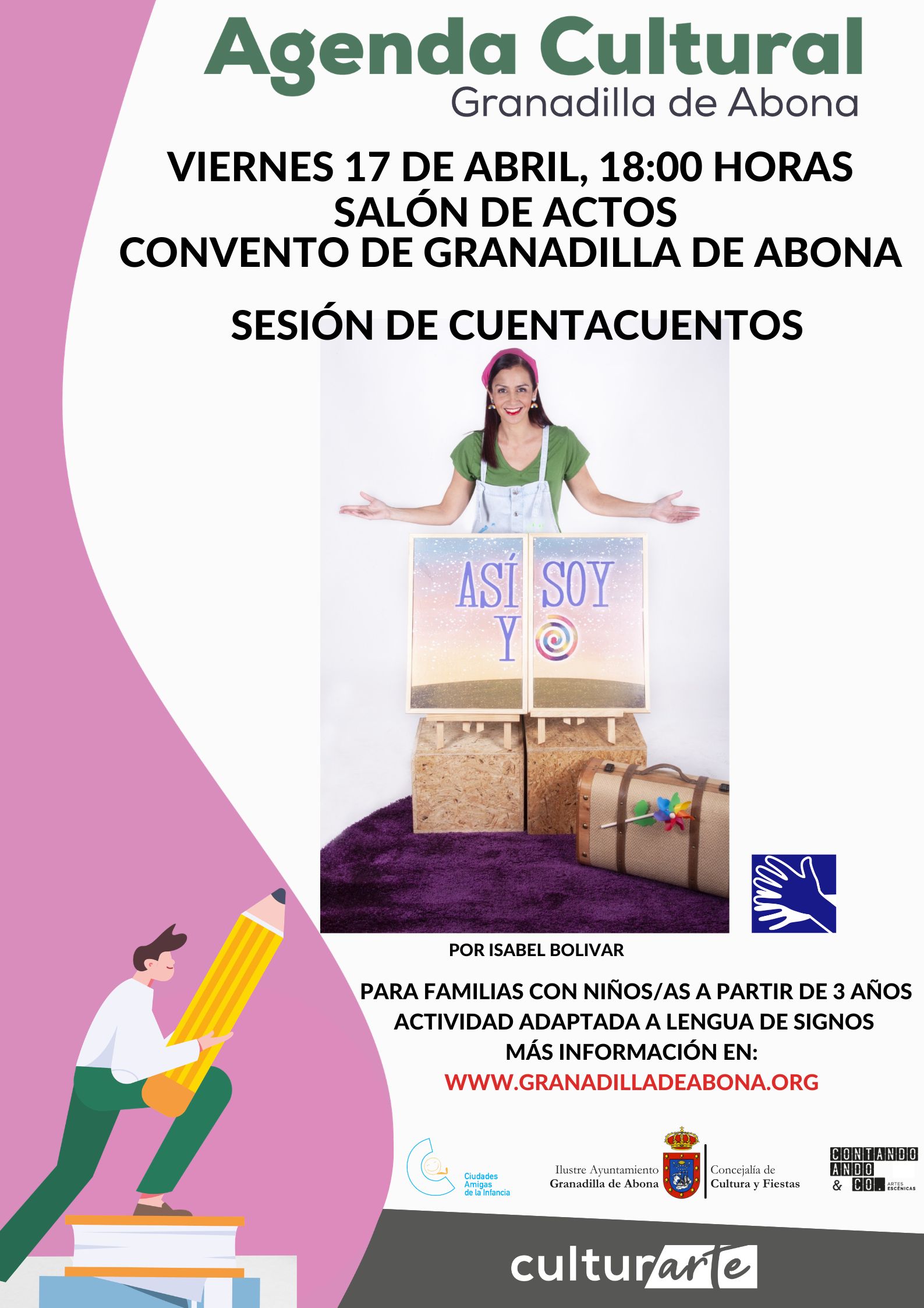 El Ilustre Ayuntamiento de Granadilla de Abona, a través de la Concejalía de Cultura y Fiestas, cuyo responsable es Carlos Abismael Díaz Barreto, invita a la población a participar en la sesión de cuentacuentos “Así soy yo“, realizada por Isabel Bolivar, el viernes 17 de abril a las 18:00 horas en el Salón de Actos del Convento de Granadilla de Abona.