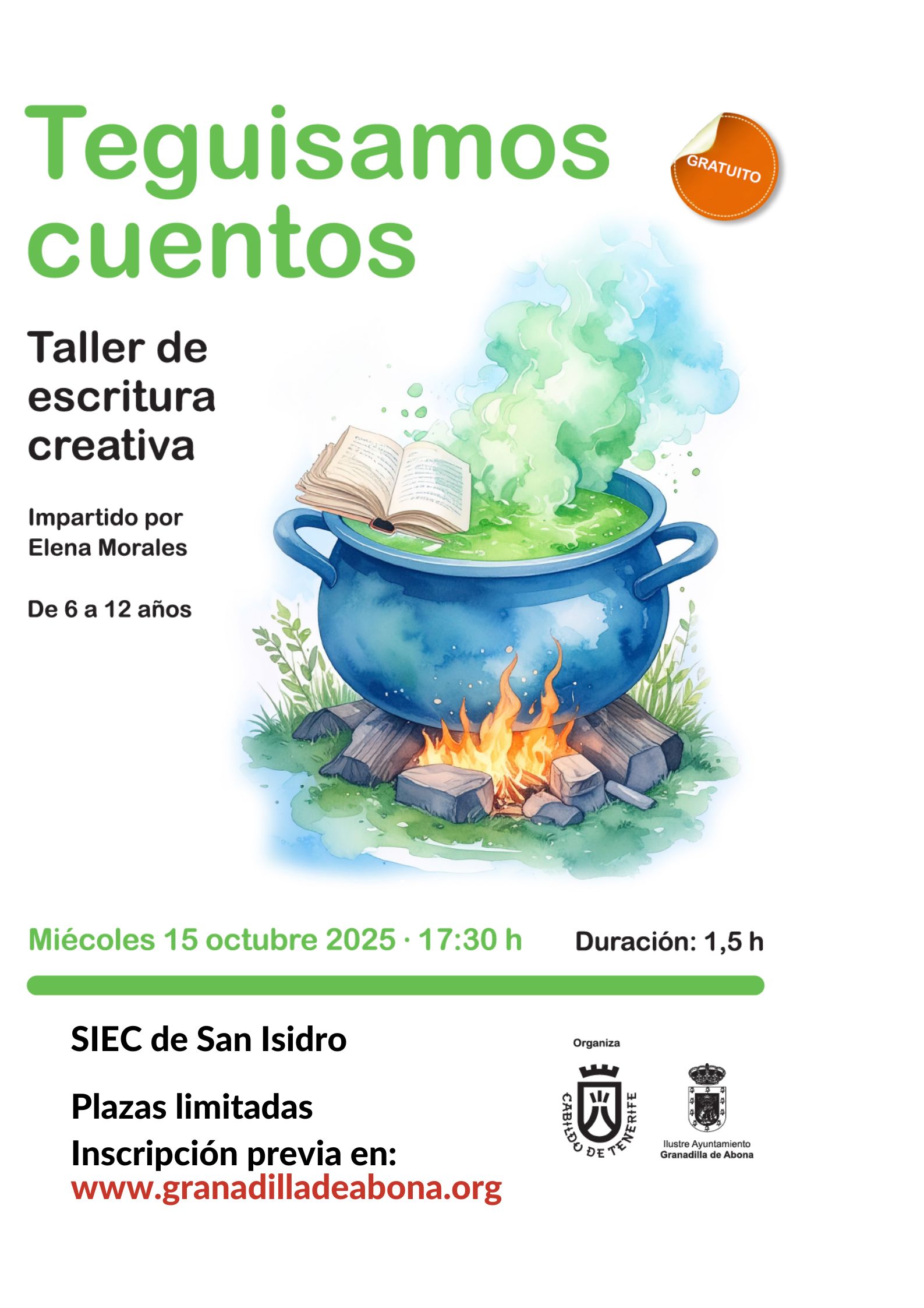 El Ilustre Ayuntamiento de Granadilla de Abona, a través de la Concejalía de Cultura y Fiestas, cuyo responsable es Carlos Abismael Díaz Barreto , invita a la población a participar en el » Taller de Escritura Creativa «, realizado por Elena Morales y organizado por el Cabildo de Tenerife y la Concejalía de Cultura del Ilustre Ayuntamiento de Granadilla de Abona, que se impartirá el miércoles 15 de octubre a las 17:30 horas en el SIEC de San Isidro.