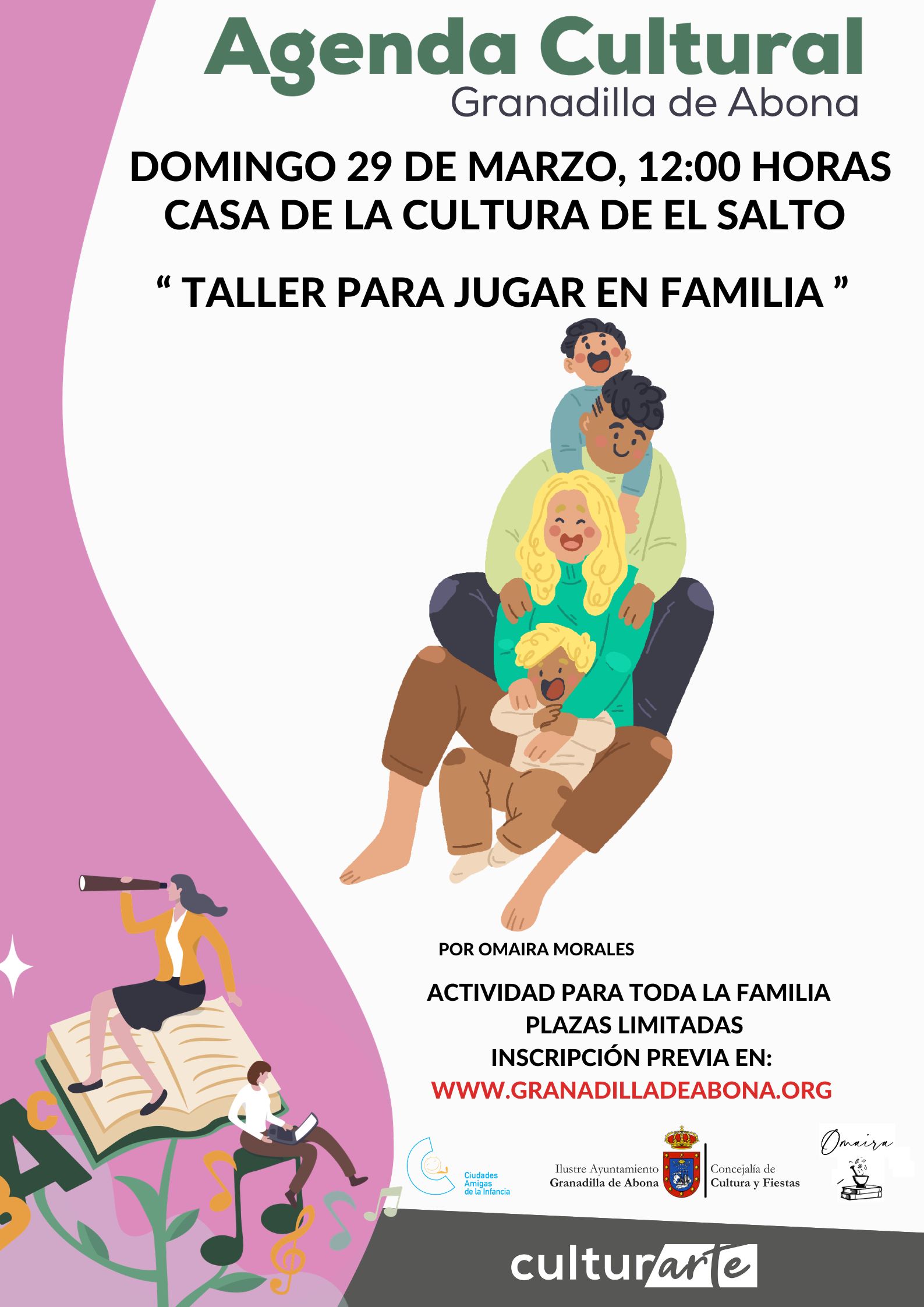 El Ilustre Ayuntamiento de Granadilla de Abona, a través de la Concejalía de Cultura y Fiestas, cuyo responsable es Carlos Abismael Díaz Barreto, invita a la población a participar en la actividad “ Taller de Juegos en Familia “, realizada por Omaira Morales, el domingo 29 de marzo a las 12:00 horas en la Casa de la Cultura de El Salto.