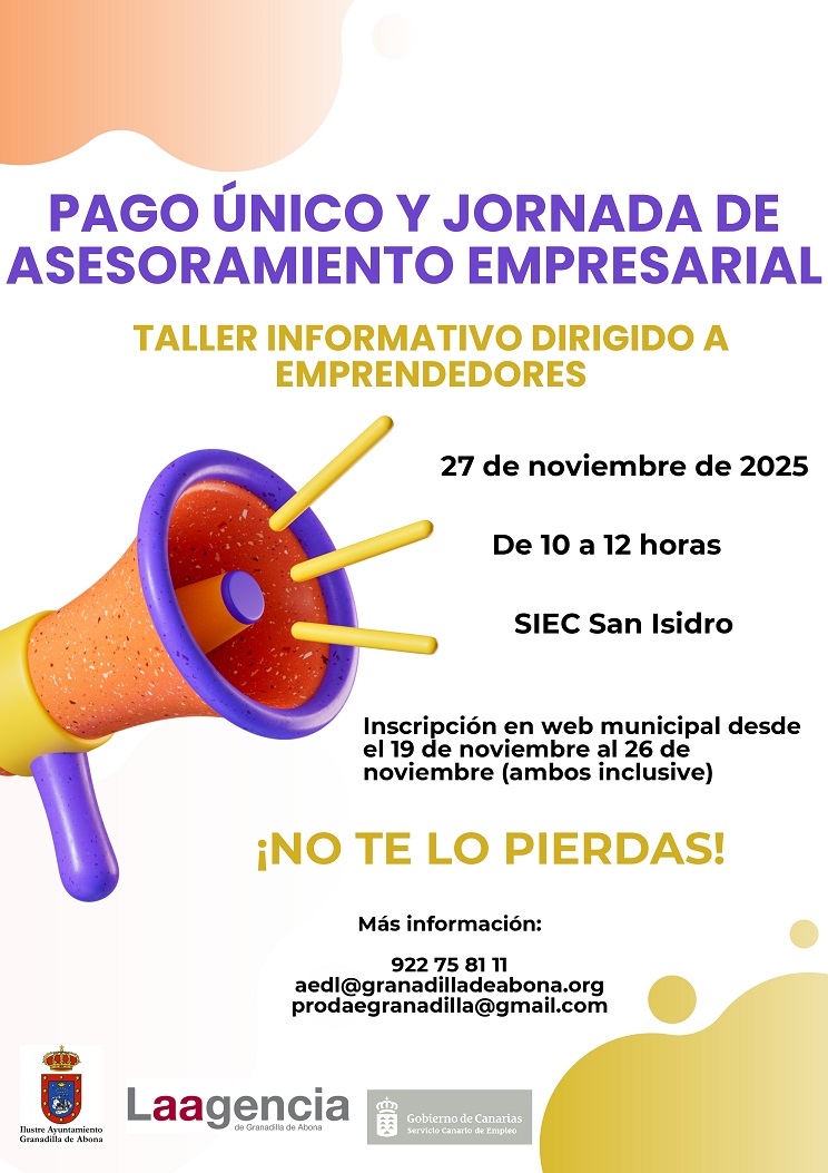 La Agencia de Empleo y Desarrollo Local del Ayuntamiento de Granadilla de Abona imparte un TALLER INFORMATIVO sobre EL PAGO ÚNICO + JORNADA DE ASESORAMIENTO EMPRESARIAL.