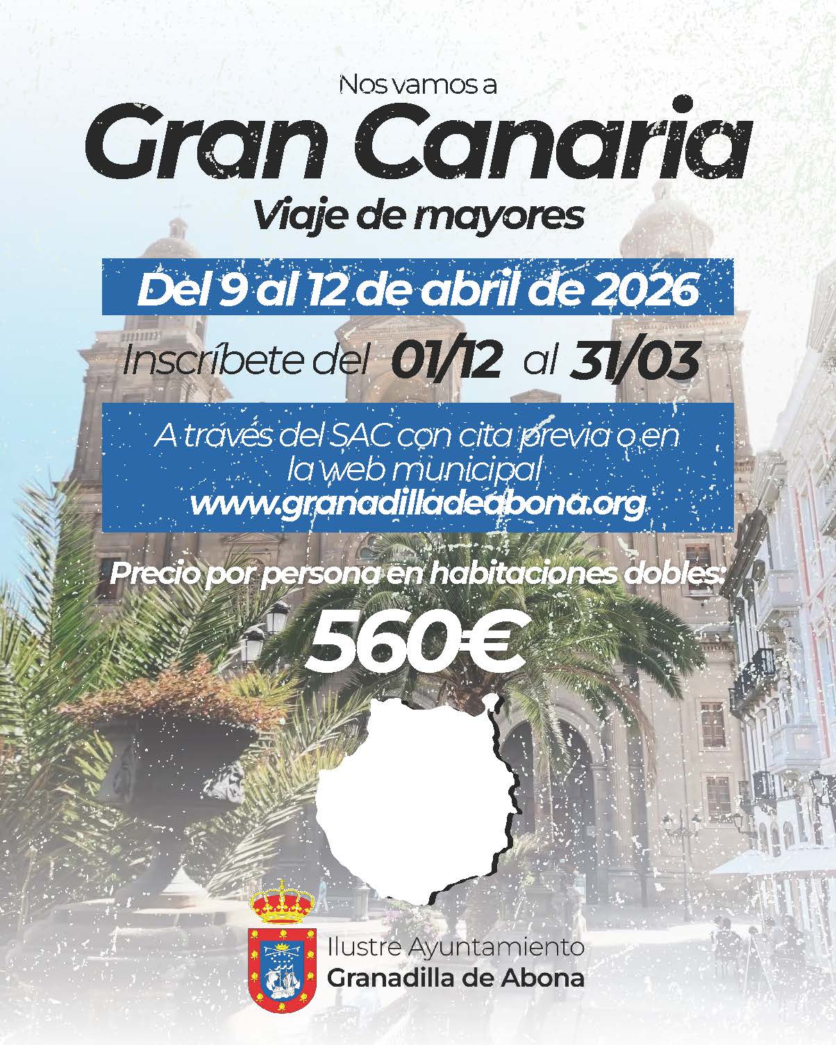 El Ilustre Ayuntamiento de Granadilla de Abona, a través de la Concejalía de Tercera Edad,que dirige Doña Eudita Mendoza Navarro, les anima a participar al viaje de “ Gran Canaria”.