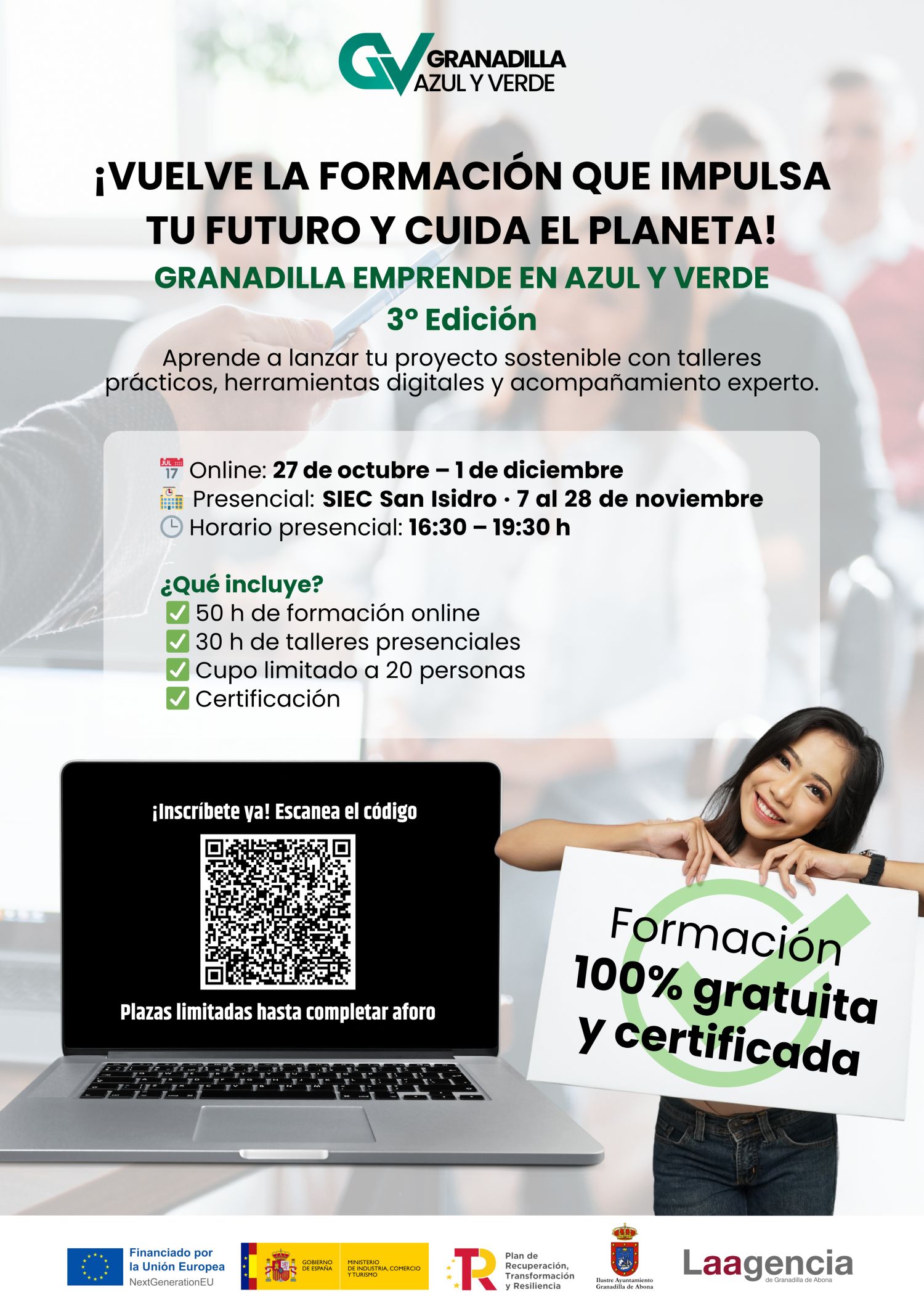 Llega la 3ª Edición de Granadilla Emprende en Azul y Verde, una formación organizada por la Agencia de Empleo y Desarrollo Local del Ayuntamiento de Granadilla de Abona cuya responsable es Carmen Delia Mesa Cabrera, pensada para ayudarte a lanzar tu proyecto sostenible con talleres prácticos, herramientas digitales y acompañamiento experto.