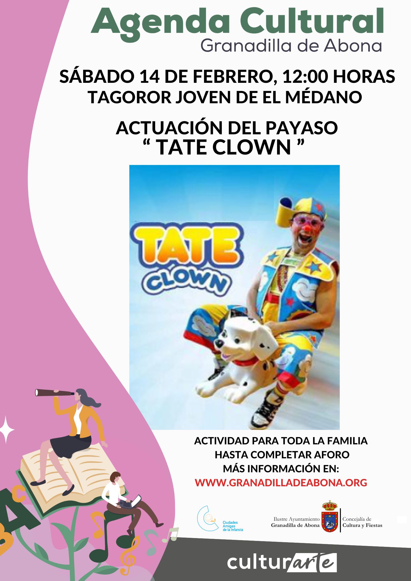 El Ilustre Ayuntamiento de Granadilla de Abona, a través de la Concejalía de Cultura y Fiestas, cuyo responsable es Carlos Abismael Díaz Barreto, les invitan a la actuación del payaso » Tate Clown «, el sábado 14 de febrero a las 12:00 horas en el Tagoror Joven de El Médano.