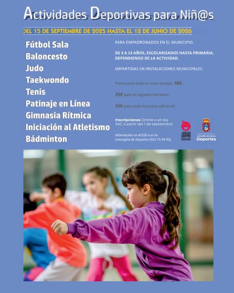 El Ayuntamiento de Granadilla de Abona, a través de la concejalía de Deportes que dirige Fredi Oramas Chávez, informa de que a partir del 1 de septiembre se abre el plazo para la inscripción en las actividades deportivas municipales para niños del curso 2025-2026. La inscripción se podrá realizar en los SAC del municipio de forma presencial, y de forma online a través de la sede electrónica en la web institucional. Para más información en el 010, concejalía de Deportes o en la web municipal www.granadilladeabona.org Esta iniciativa es para empadronados en el municipio, entre 3 y 13 años, escolarizados hasta primaria y se desarrollarán en instalaciones municipales, comenzarán el 15 de septiembre y finalizarán en junio del 2026.