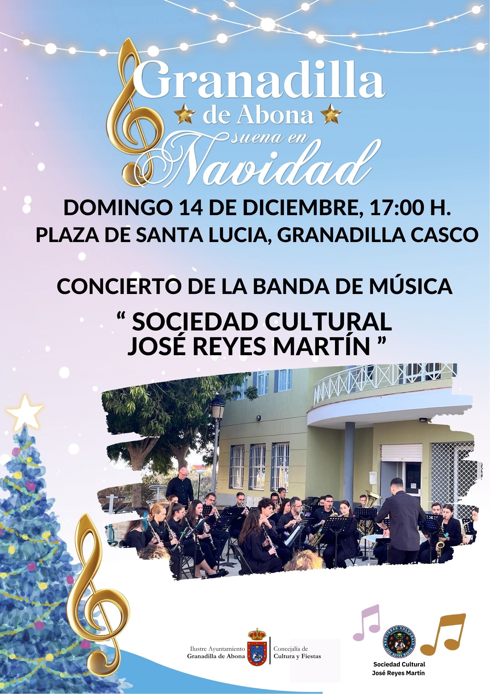 El Ilustre Ayuntamiento de Granadilla de Abona, a través de la Concejalía de Cultura y Fiestas, cuyo responsable es Carlos Abismael Díaz Barreto, les invitan al » Concierto de la Banda de Música Sociedad Cultural José Reyes Martín » el domingo 14 de diciembre a las 17:00 horas en la Plaza de Santa Lucía de Granadilla Casco.