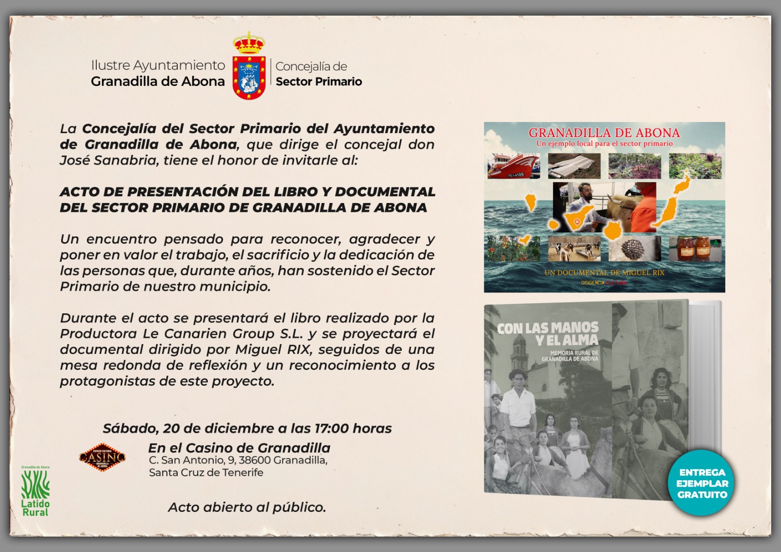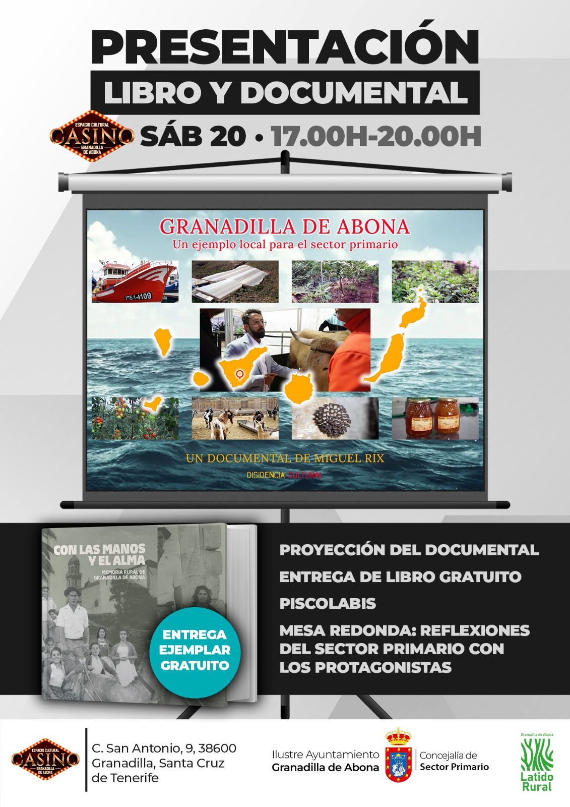 El evento acogerá la presentación de un libro realizado por la Productora Le Canarien Group S.L. y la proyección de un documental dirigido por Miguel RIX, dos trabajos que reflejan con sensibilidad y cercanía el esfuerzo, el sacrificio y la dedicación de generaciones de hombres y mujeres que han sostenido durante años el Sector Primario en Granadilla de Abona.