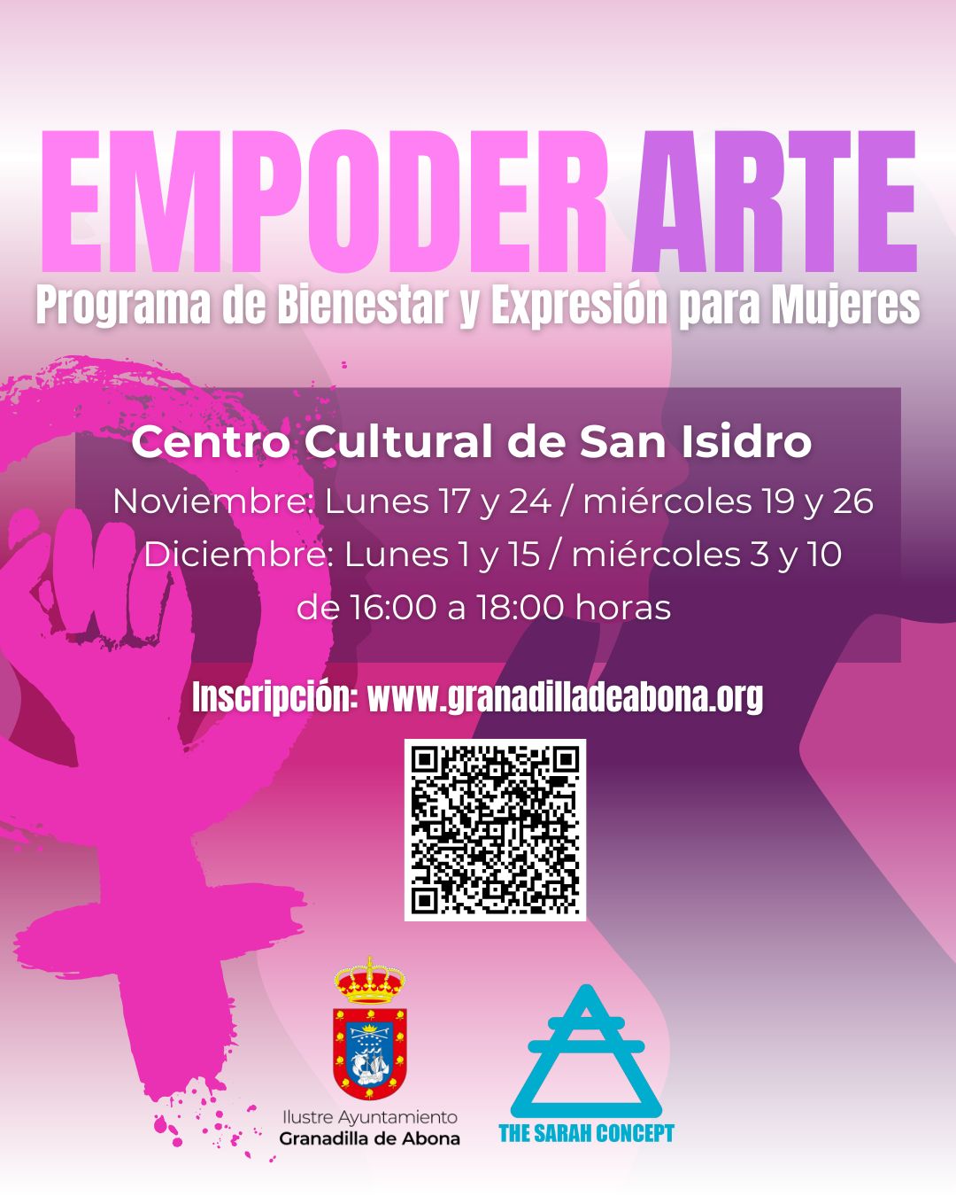Doña Eudita Mendoza Navarro, responsable de la Concejalía de Igualdad y Diversidad del Ayuntamiento de Granadilla de Abona, les invita a inscribirse en el Proyecto de Expresión Artística “EMPODERARTE”, que se va a llevar a cabo a partir del día 17 de noviembre, en el Centro Cultural de San Isidro.