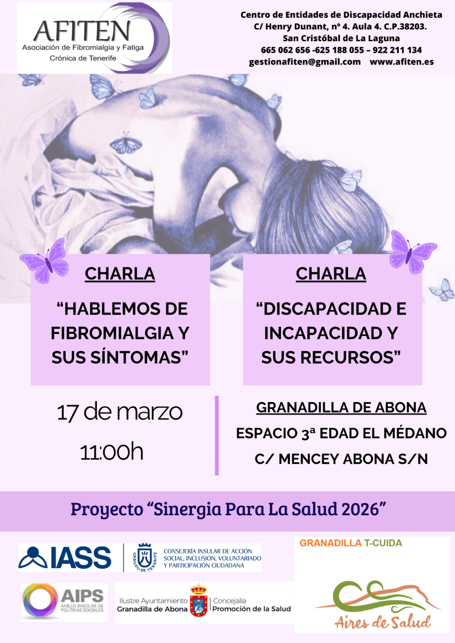 El Ayuntamiento de Granadilla de Abona, a través de la concejalía de Promoción de la Salud que dirige María Candelaria Chinea Niebla, conjuntamente con la Asociación de Fibromialgia y Fatiga Crónica de Tenerife (AFITEN), ofrece nuevamente el ´Proyecto para LA Salud 2026´, que consta de un conjunto de charlas relacionadas con la fibromialgia y fatiga crónica.