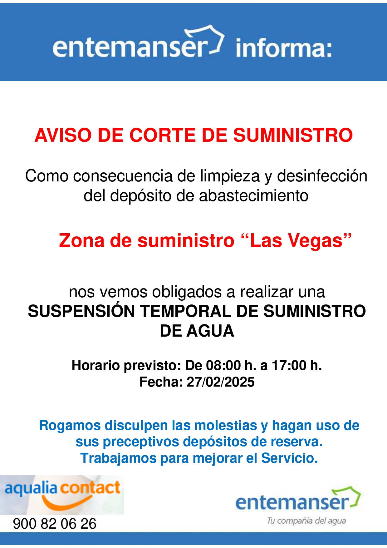 Aviso corte suministro por limpieza depósito Las Vegas