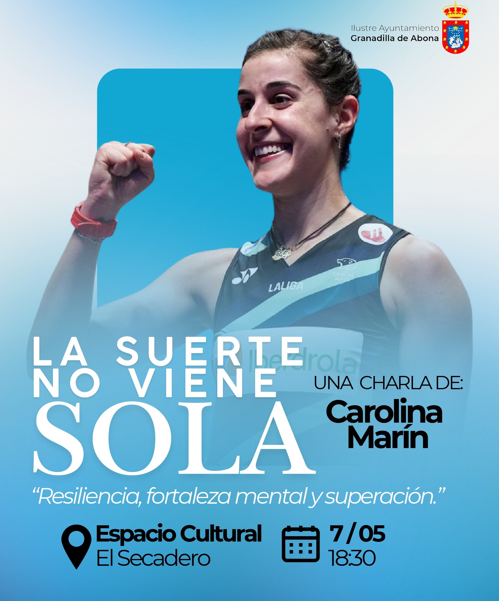 Granadilla de Abona recibe el próximo 7 de mayo a la deportista olímpica Carolina Marín, en una jornada institucional durante la que visitará el club deportivo local CB Los Hinojeros y ofrecerá una charla motivacional abierta al público bajo el título “La suerte no viene sola” .