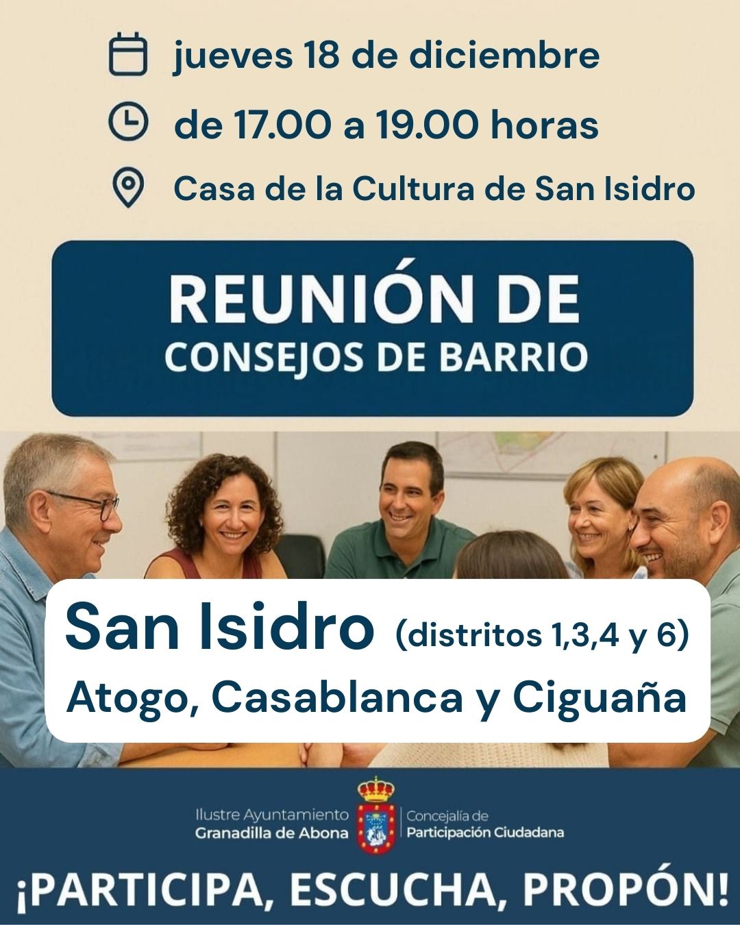 El Ayuntamiento de Granadilla de Abona, a través de la Concejalía de Participación Ciudadana, dirigida por Adaisy Arias Pérez, convoca una nueva reunión de los Consejos de Barrio, que se celebrará este jueves 18 de diciembre, en horario de 17:00 a 19:00 horas, en la Casa de la Cultura de San Isidro.