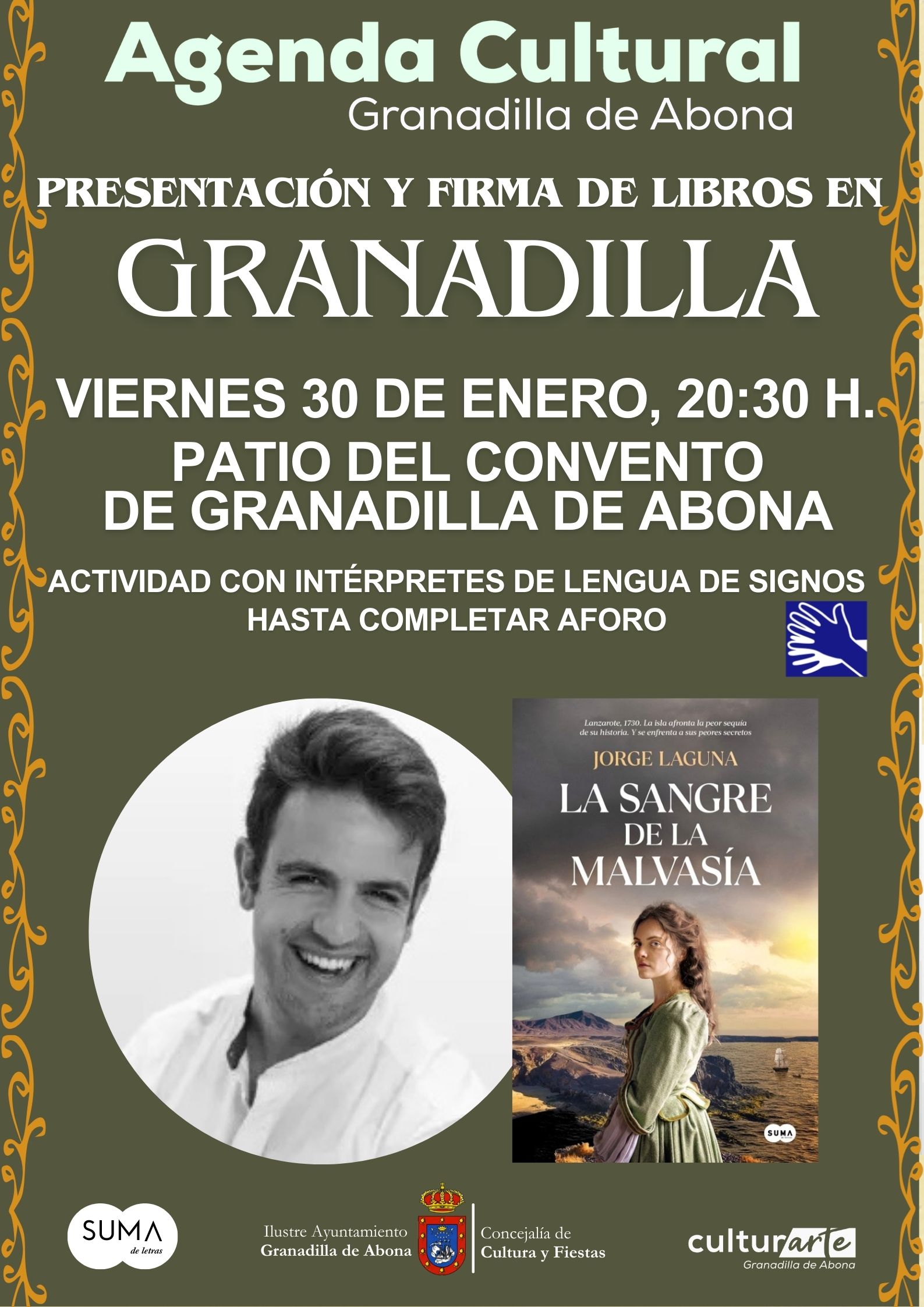 El Ilustre Ayuntamiento de Granadilla de Abona, a través de la Concejalía de Cultura y Fiestas, cuyo responsable es Carlos Abismael Díaz Barreto, les invitan a la presentación del libro » La Sangre de la Malvasía «, del escritor Jorge Laguna, el viernes 30 de enero a las 20:30 horas en el Patio del Convento de Granadilla de Abona.